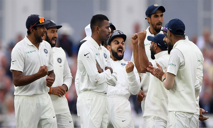 इंग्लैंड के खिलाफ तीसरे टेस्ट के दूसरे दिन का खेल खत्म होने तक भारत ने दूसरी पारी में दो विकेट के नुकसान पर 124 रन बना लिए हैं। इसी के साथ भारत की इंग्लैंड पर कुल बढ़त 292 रन की हो गई है। चेतेश्वर पुजारा 33 रन और कप्तान विराट कोहली 8 रन बनाकर क्रीज पर हैं। दूसरी पारी में तेजी से अर्धशतक की तरफ बढ़ रहे शिखर धवन को आदिल रशीद ने 44 रन के स्कोर पर स्टंप आउट कराया।धवन और पुजारा के बीच 51 रन की साझेदारी हुई. लय में दिख रहे केएल राहुल भी 36 रन बनाकर बेन स्टोक्स की गेंद पर बोल्ड हुए। इससे पहले पहली पारी में इंग्लैंड 161 रन पर ऑलआउट हो गई।इंग्लैंड की ओर से जोस बटलर ने सबसे ज्यादा 37 रन बनाए. हार्दिक पांड्या ने लगातार ओवरों में 4 विकेट लेकर इंग्लैंड को बड़े स्कोर तक पहुंचने से रोक दिया। उन्होंने कुल पांच बल्लेबाजों को आउट किया।यह पहला मौका है जब पंड्या ने एक पारी में पांच विकेट लिए। भारत के लिए इशांत शर्मा दूसरे सबसे सफल गेंदबाज रहे। उन्होंने सलामी बल्लेबाज एलिस्टर कुक (29) और ओली पोप (10) के अहम विकेट हासिल किए। भारतीय टीम पहली पारी में 329 रन पर ऑलआउट हो गई। दूसरे दिन 307/6 के स्कोर से आगे खेलने उतरी टीम इंडिया ने जल्दी-जल्दी विकेट गंवाए। पहले स्टुअर्ट ब्रॉड ने पंत को 25 और अश्विन को 12 रन के निजी स्कोर पर बोल्ड किया. इसके बाद एंडरसन ने एक ही ओवर में ईशांत और शमी को आउट कर भारत को बड़ा स्कोर खड़ा करने से रोक दिया. भारत के लिए सबसे ज्यादा 97 रन कप्तान कोहली ने बनाए। रहाणे ने भी 81 रन बनाकर टीम को 300 पार पहुंचाने में अहम किरदार निभाया। इंग्लैंड के लिए एंडरसन, ब्रॉड और वोक्स ने 3-3 विकेट हासिल किए।